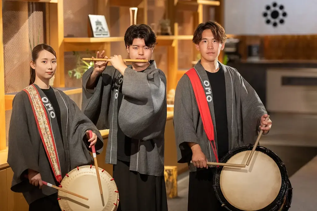 ハイライトは、かつて城で合図として用いられた太鼓をモチーフに、現代風にアレンジしたOMO5熊本限定の演奏です。地元の若手演奏家による力強くスタイリッシュな響きは、非日常的な空間を生み出し、訪れた人々が自然と集う賑わいを演出します。