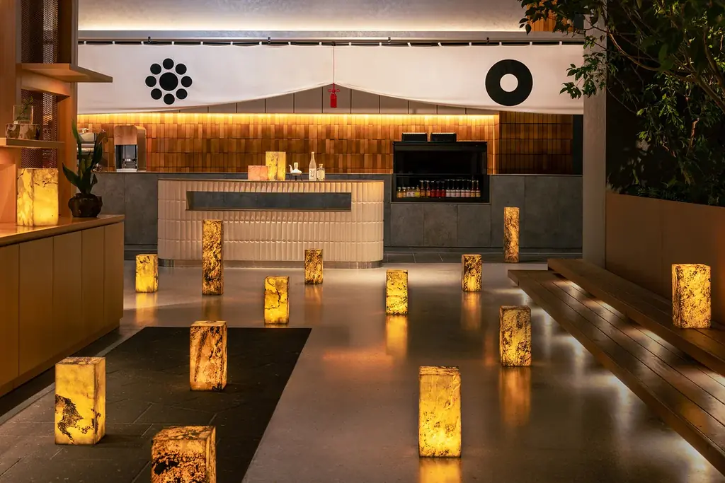 パブリックスペース「OMOベース」では、熊本城を想起させる和の装飾を配し、城下町の賑わいを夜に再現します。蛇の目紋や九曜紋をあしらったのれん、地図石、そして震災で瓦礫となった瓦を用いた灯りなど、歴史的な要素を現代のデザインに織り込んだ演出です。