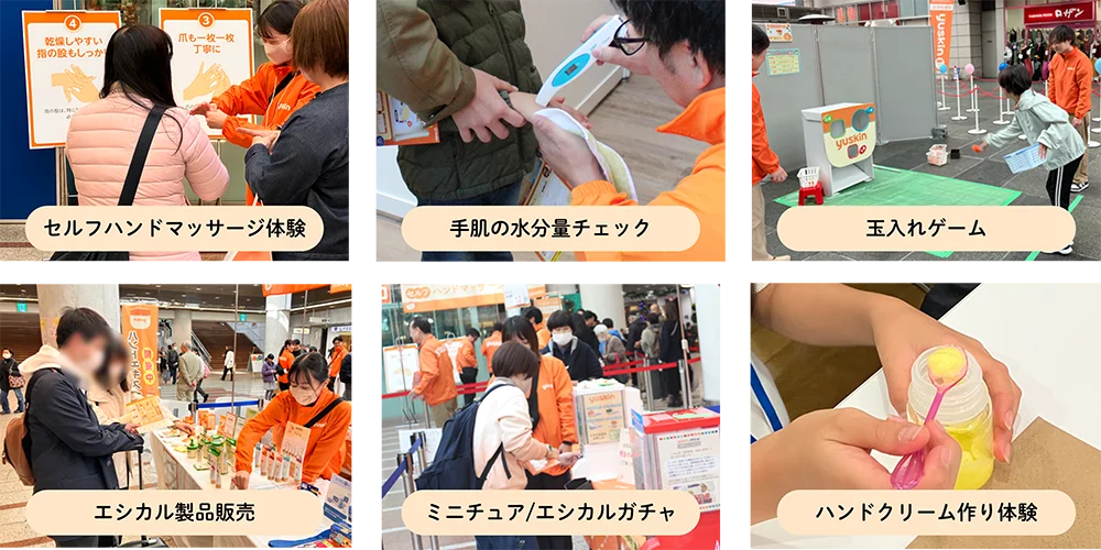 主な体験・催し セルフハンドマッサージ、手肌の水分量チェック、ハンドクリーム作り、玉入れゲーム、ミニチュアガチャ、エシカルガチャ