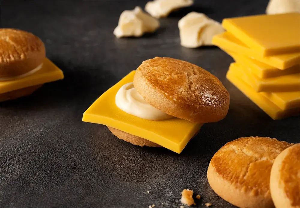 具体的には、チーズパウダーを練りこんだサクサク食感のバンズクッキーに、チェダーチーズとホワイトショコラをブレンドしたミルキーなチーズショコラをたっぷりとサンドし、さらにホイップショコラをトッピングしています。塩味と甘味のバランスを調整することで、後を引く風味に仕上げられています。