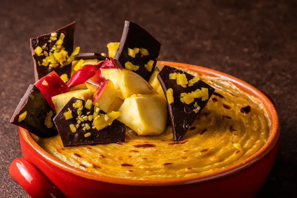 「洋梨のショコラブリュレ」はほろ苦いショコラのブリュレにみずみずしい洋梨を添え、キャラメリゼの香ばしさと果実の爽やかな甘みのバランスを意図しています。口当たりの対比が設計されたデザートです。