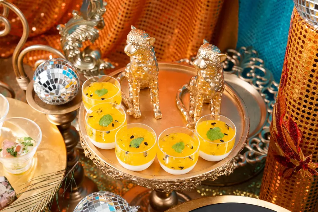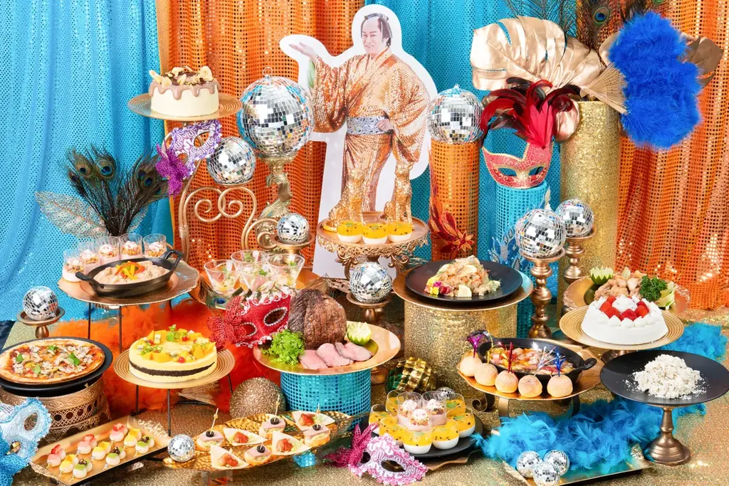フェア名は「マツケンサンバ ブッフェカーニバル~お腹いっぱい食べ明かそう・オレ!~」。約30種類のメニューを揃え、ゴールドの世界観にオレンジやブルーの差し色を加えた空間演出で提供します。