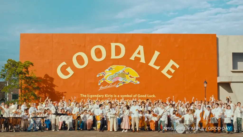 「まったく新しいキリンビールはじまる篇」では、綾瀬はるかさんの力強い宣言をきっかけに、大森元貴さんのカウントとともにMrs. GREEN APPLEと約200名のビッグバンドがテーマソング「GOOD DAY」を演奏する演出です。4人のブランドリーダーとビッグバンドのメンバーがリズムに合わせて手をたたき、歌い、乾杯する場面が描かれ、次世代定番ビール誕生の高揚感を表現しています。最後は綾瀬さんの「そうとういい出来です」というコメントで締められます。