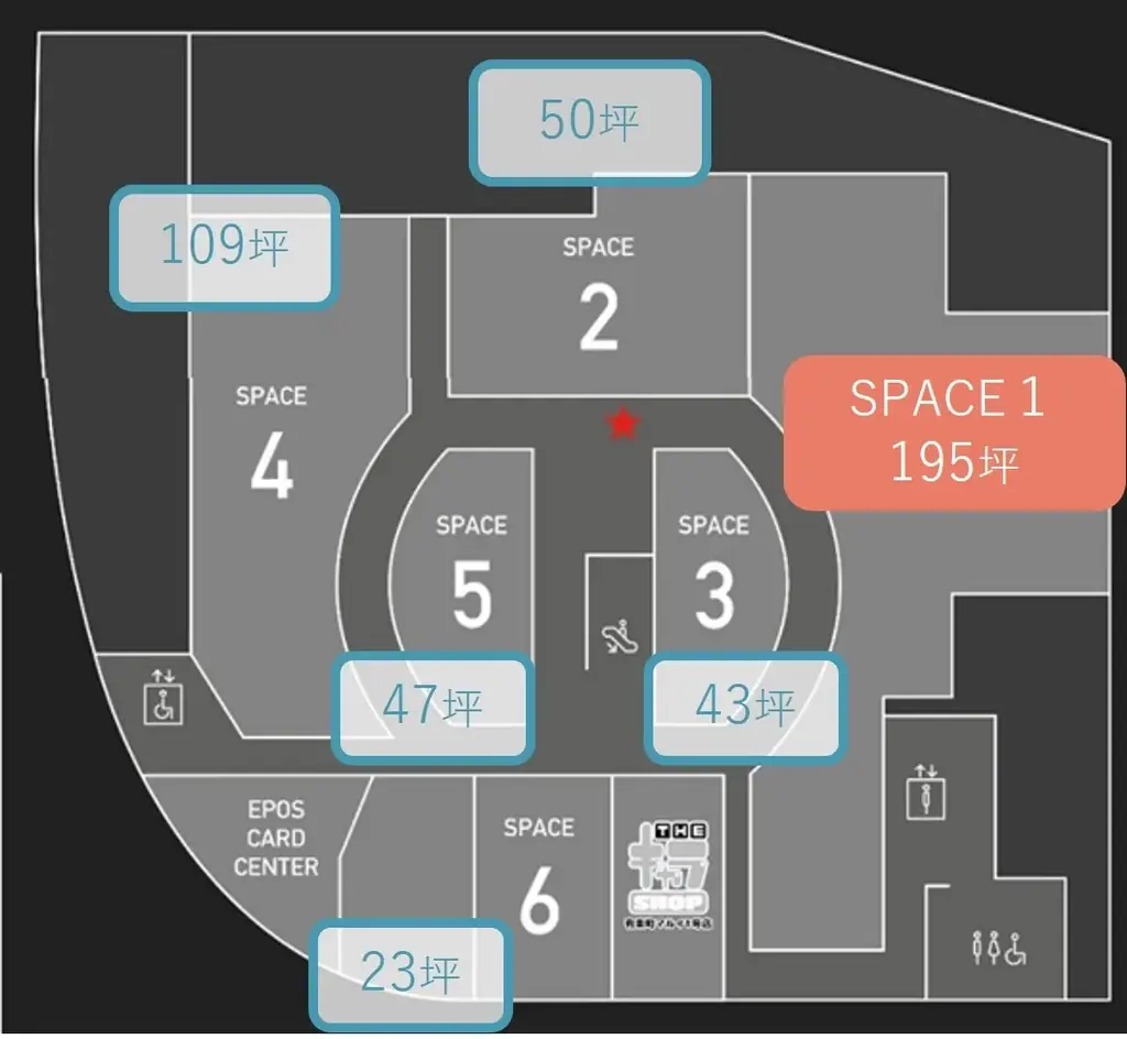 | 新設区画 | <SPACE1> 約200坪(ホール型、クローズド使用可、大型LED・高性能スピーカー搭載) |