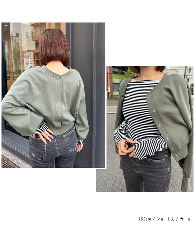 前後どちらを前にしても着られるデザインで、ボタンを外せば羽織、留めればトップスに。ショート/レギュラー丈があり着回しや体型カバーに便利。抗ピリング素材採用で毛玉ができにくいです。