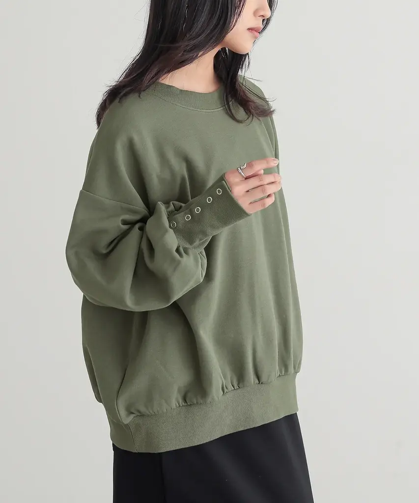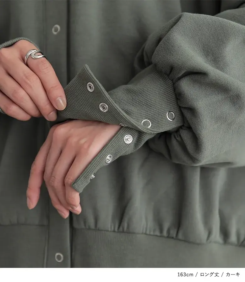 デザイン面では、袖口や身頃のシルエットに特徴があります。長めの袖口と開閉可能なカフスボタン、身頃と袖口に施したギャザーにより、生地の落ち感やふんわりとしたフォルムを作ることで、女性らしさと体型カバーを両立させる設計になっています。