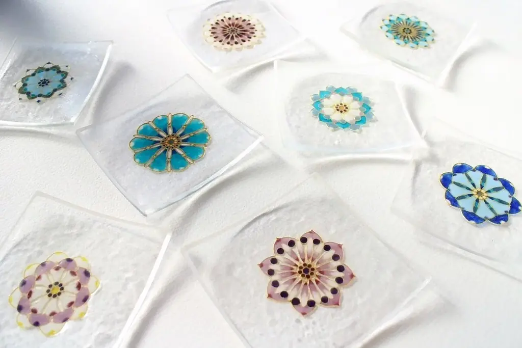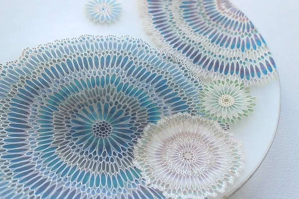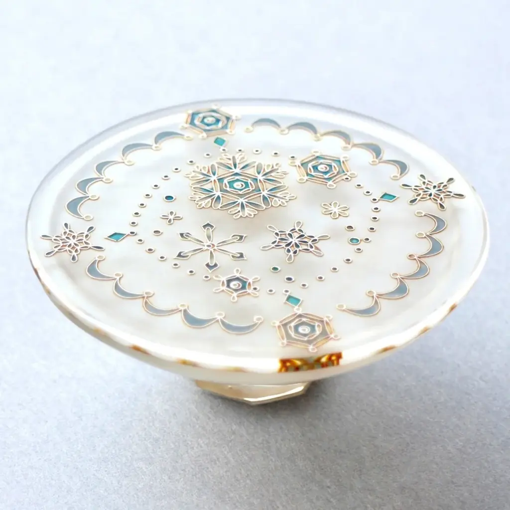 塚原梢氏はガラス胎七宝の技法を用いることで、ガラスの透明感と銀線(有線七宝)の細やかな模様が同居する表現を展開しています。モチーフは植物や雪の結晶など自然に根ざしたものが中心で、光の当たり方によって表情が変化する点が魅力です。
