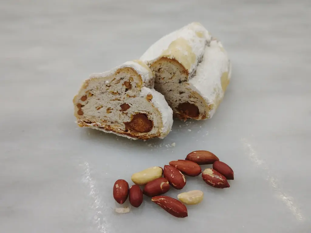 また同会場では、酒まつり限定の「シュトレン」を販売します。このシュトレンは、できる限り東広島産の素材を使用し、ピーナッツ、米粉、山椒、黒豆、その他ナッツ類を取り入れることで和の要素を強めた一品です。ドライフルーツの代わりに黒豆やナッツを用い、ピーナッツの香ばしさと生山椒の香りが日本酒の旨味と調和する設計になっています。