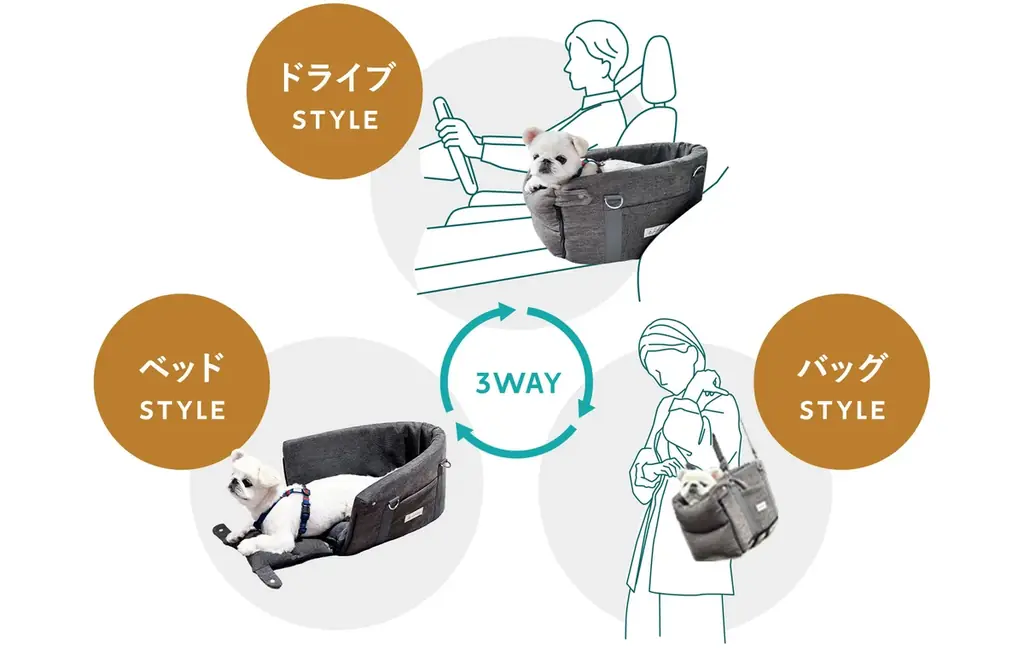 3WAYの切り替えは構造的に簡潔で、運転席と助手席のアームレストに固定して車内専用の特等席を作る「ドライブベッド」スタイルから、フロントパネルを開いてクッションを展開する「ふかふかベッド」スタイル、そして着脱式のベルトを用いる「キャリーバッグ」スタイルへと移行できます。いずれの状態でも付属品により固定や保護が可能です。