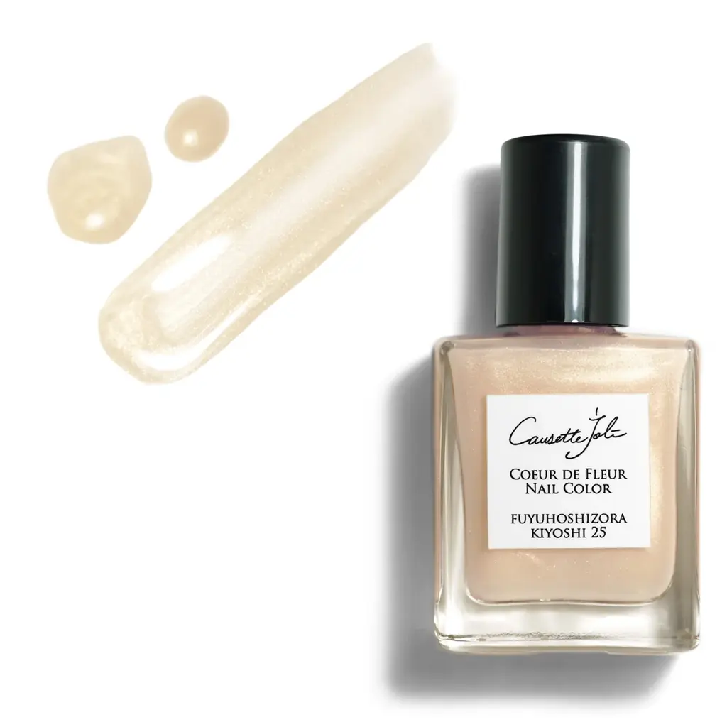 FUYUHOSHIZORA KIYOSHI 25は「雪明かりのドレスに星のヴェールを。」という表現で紹介される、繊細に瞬くミルキーゴールドです。Opacityは1で、複数色のパールが混ざった透明感のある煌めきを持ちます。