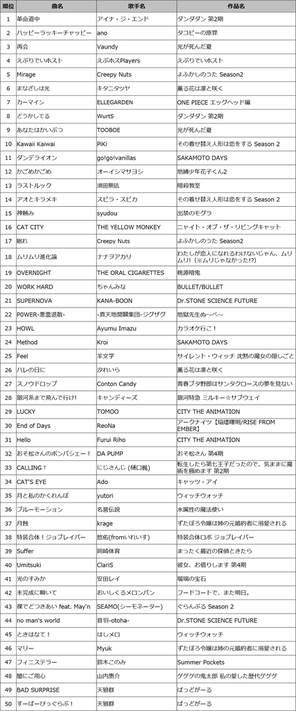| ランキング結果(主な楽曲) | 1位:アイナ・ジ・エンド「革命道中」(『ダンダダン』第2期OP) 2位:あのちゃん「ハッピーラッキーチャッピー」(『タコピーの原罪』OP) 4位:えぶホスPlayers「えぶりでいホスト」(『えぶりでいホスト』主題歌) 28位:キャンディーズ「銀河系まで飛んで行け!」(『銀河特急 ミルキー☆サブウェイ』主題歌) その他:Vaundy、ELLEGARDENなどの楽曲も上位に顔を出す。 |