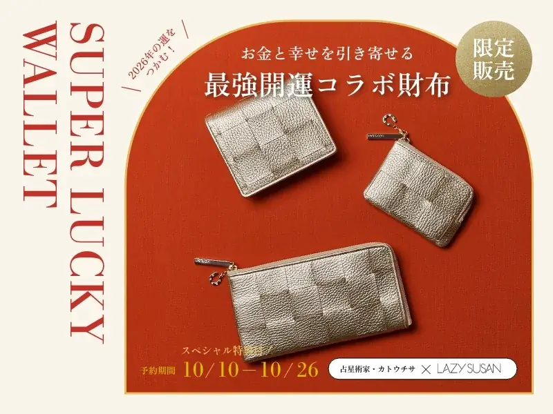 株式会社レイジースーザン(東京都港区/代表者:春日政彦)は、占星術家カトウチサ氏監修による『2026 最強開運スペシャルコラボ財布』を、2025年10月10日(金)から先行予約販売します。本コラボは、2026年に幸運を呼ぶとされる最強カラー「ゴールド&レッド」を採用し、機能性と収納力を両立させたラインナップを揃えています。