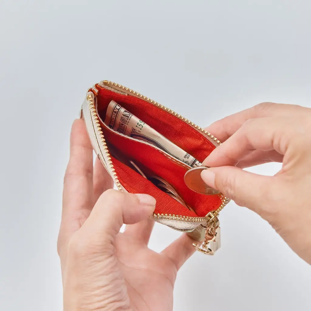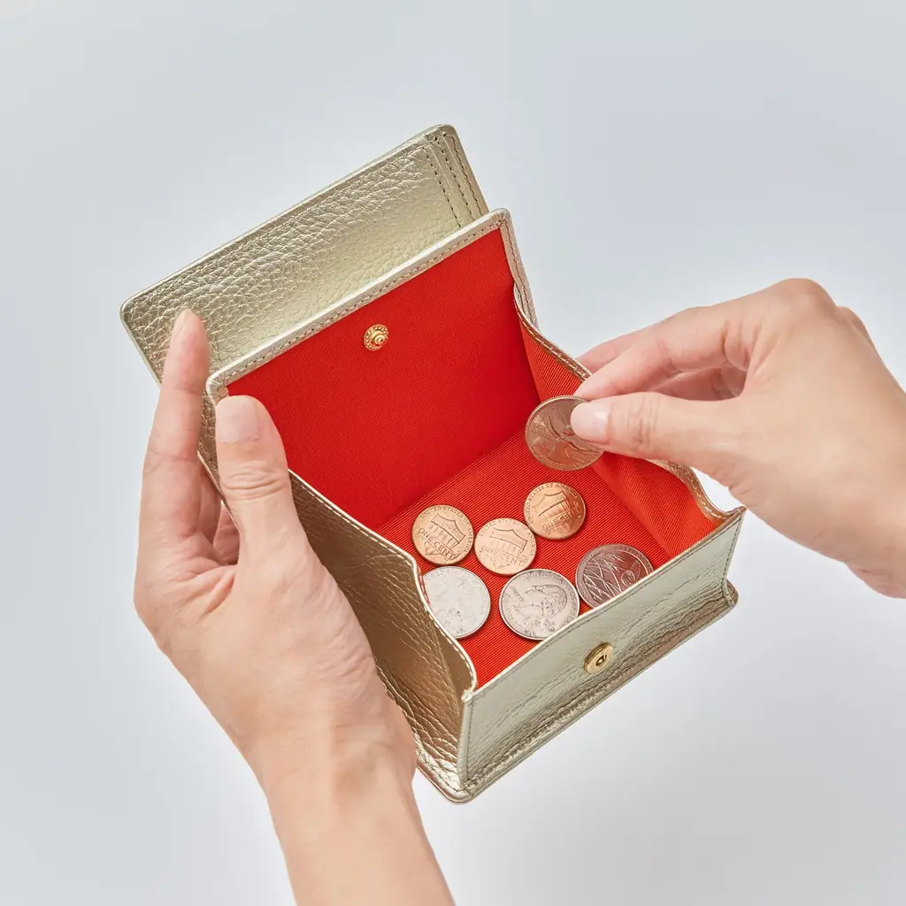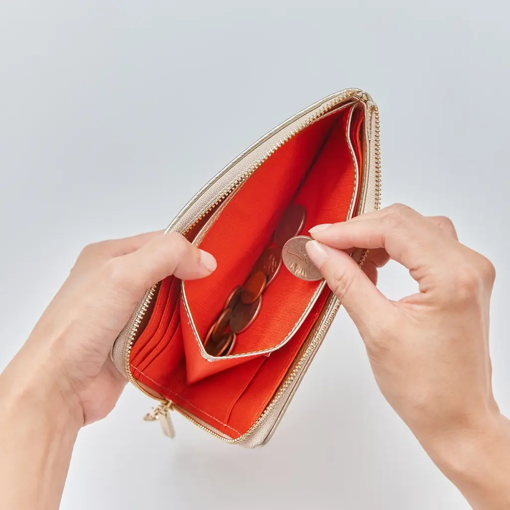 - 朱赤=ヴァーミリオンの裏地:真赤ではなく朱赤に近い色味が施され、古来の守護や勝利、浄化の意味を持たせています。英語表記のvermillionに含まれる“million”と結びつけて金運の要素を演出しています。