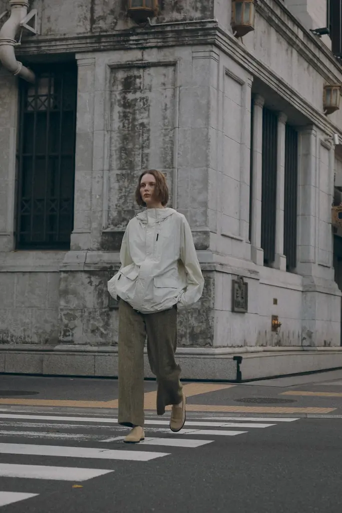 今回のコレクションで中核となるのは、アウトドアでの実績が高い素材と縫製の設計です。PERTEX〈UNLIMITED〉は軽量で引裂強度に優れ、かつ適切な防風性を備えるため、マウンテンパーカーやパラシュートパンツといったアウターに適しています。