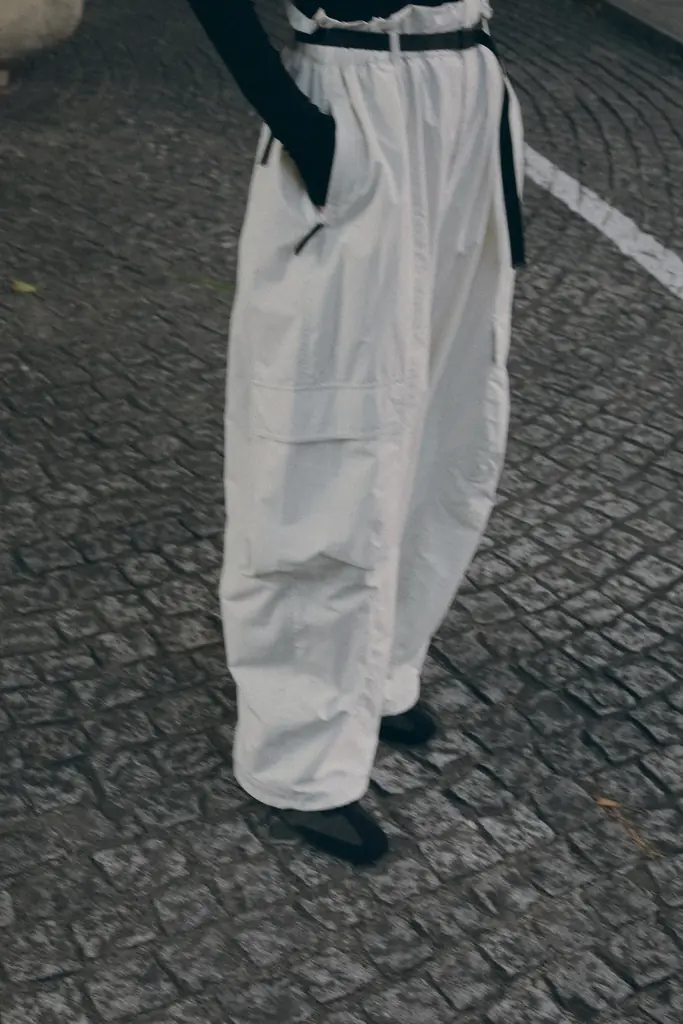 大胆なボリューム感が特徴のパラシュートパンツは、脇に施した立体的なポケットが奥行きを生み出すデザインです。ハイウエスト仕様によりスタイルアップを図りつつ、ウエスト内側にゴムストッパーを設け安定した穿き心地を実現しています。