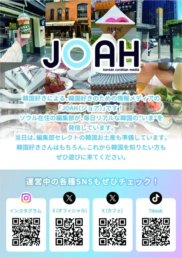 当日は各ブースを回って楽しむためのスタンプカード(マルシェパンフレット付属)や、5スタンプごとに挑戦できるリアルガチャ(こども向け景品)など、参加型の企画も実施されます。韓国トレンドメディアJOAH編集部から来場者への韓国土産プレゼントも用意されています。