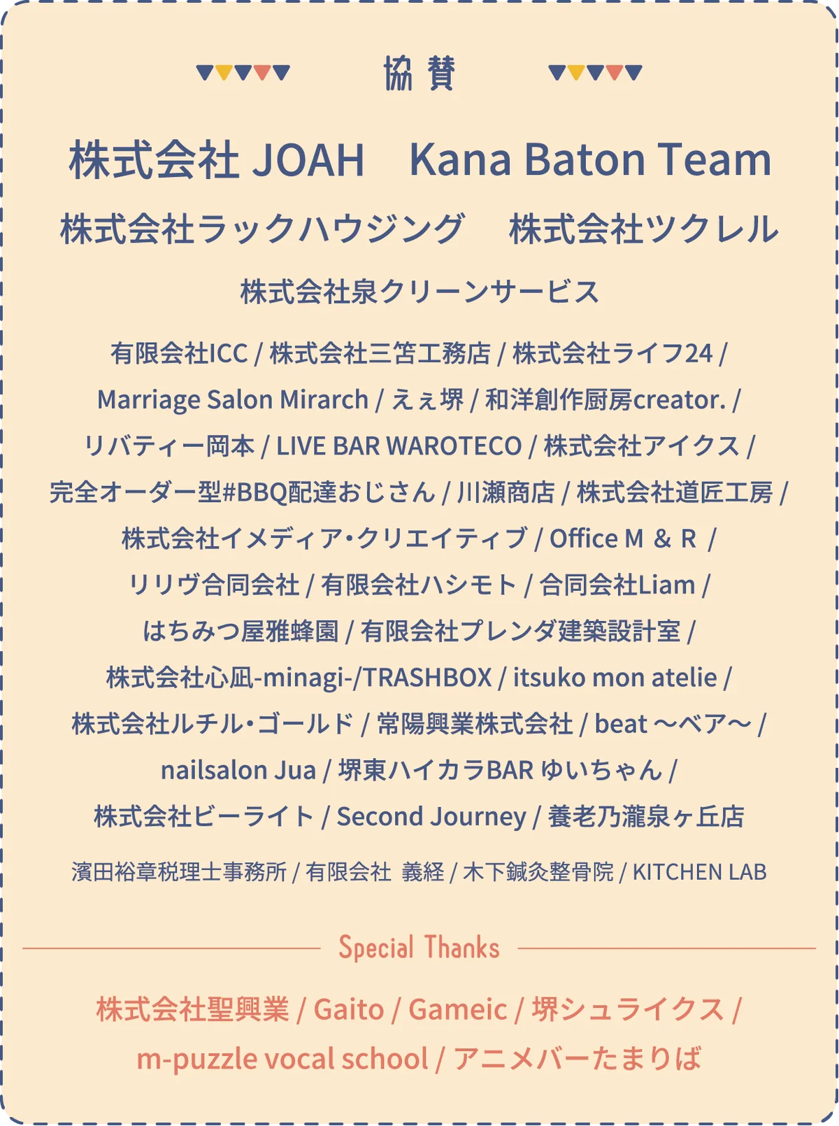 今回のトップ協賛企業は韓国情報メディア「JOAH」。ほかにKana Baton Team / baton team OWL、株式会社ラックハウジング、株式会社ツクレルなどが協賛しています。協賛・Special Thanksとしてイベント運営に協力した団体や企業も多数あります。