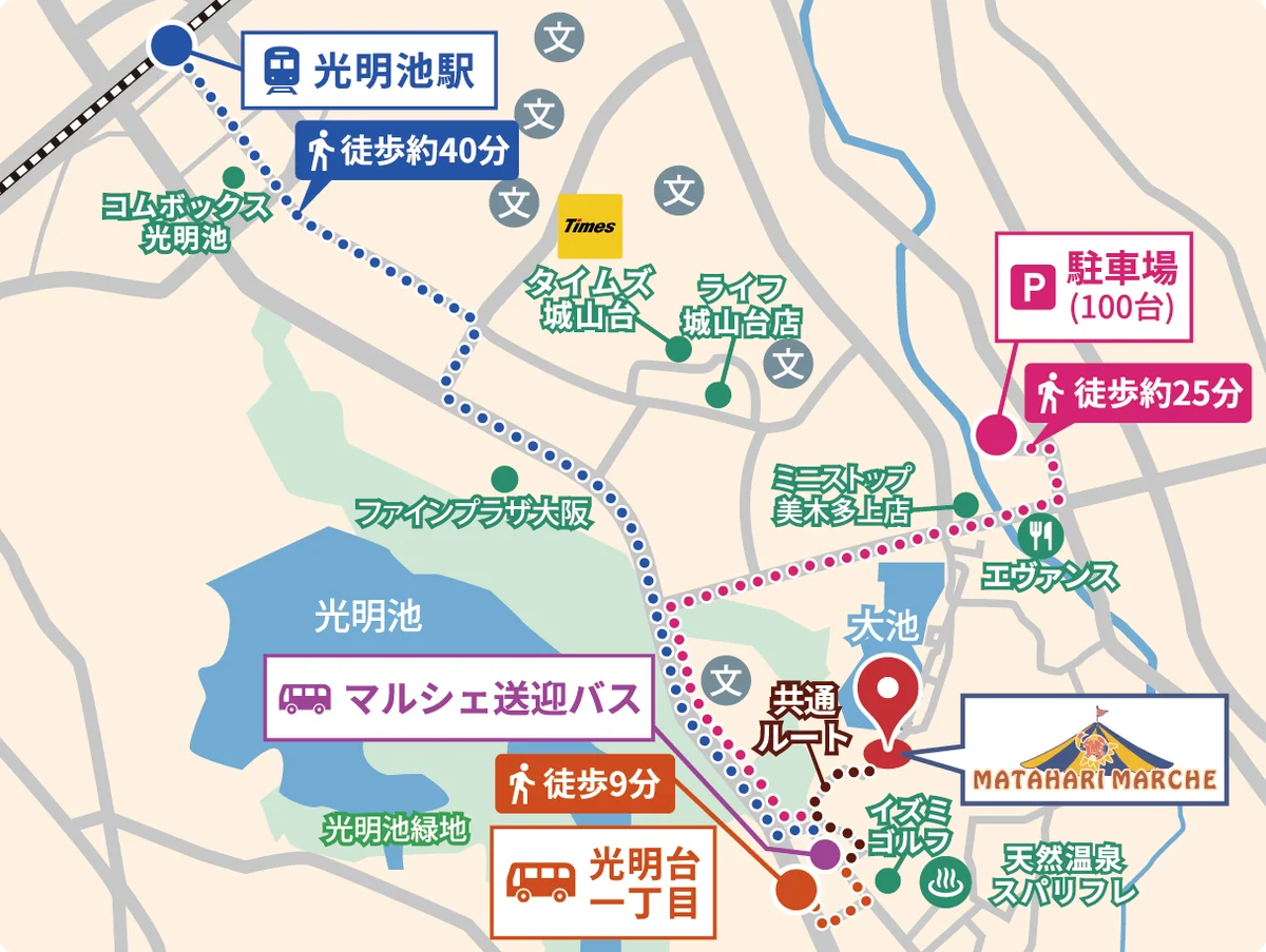送迎バスの所要時間の目安は、光明池駅から片道約10分、専用駐車場から片道約5分です。バイク・自転車利用の場合は店舗横の駐車場が利用可能です。住宅街(ヴァンベールの丘)側からの侵入は禁止されているため、指定された動線に従って移動してください。詳細や地図、参加ブース情報は公式イベントページを参照ください。