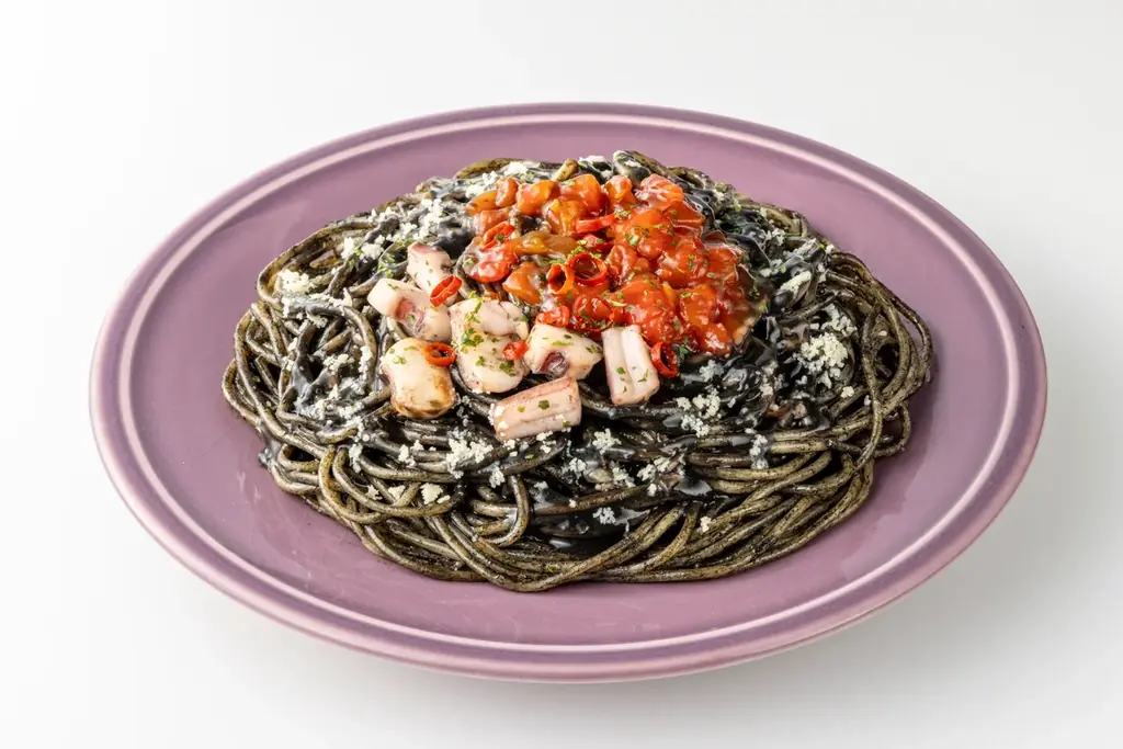- まっ黒のソースはイカスミをベースに、刻んだイカと魚介の出汁を加え、イカの旨みをしっかり感じられる構成です。トマトソースやトッピングのイカが味わいの厚みを補強し、ハロウィンらしい視覚的インパクトと海産の旨みを両立させています。
