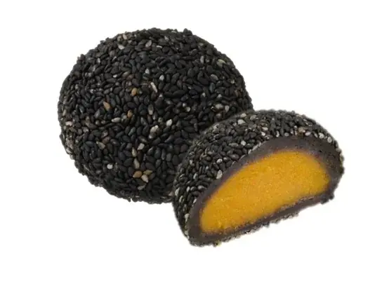 - 揚げずに焼き上げたモチモチ食感の胡麻団子に、北海道産かぼちゃペーストを使用したねっとりとかぼちゃあんを包んだ商品です。ごまの香ばしさと濃厚なかぼちゃの甘みの組合せが特徴になります。