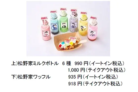 看板メニューのミルクボトルを松野家6人のカラーで展開。来場者は好みの色を選べる。また、6色のキラキラゼリーが乗った限定ワッフルや、POP UP限定の描き下ろしイラストを用いたドリンクラベル、特典ノベルティを用意。