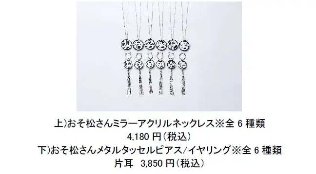 松野家6人の名前をデザインしたピアス・イヤリング、ミラーアクリルとメタルタッセルを使った耳飾り、表裏で異なる素材を使ったネックレスなど、厚みと高級感のあるアクセサリーを用意。