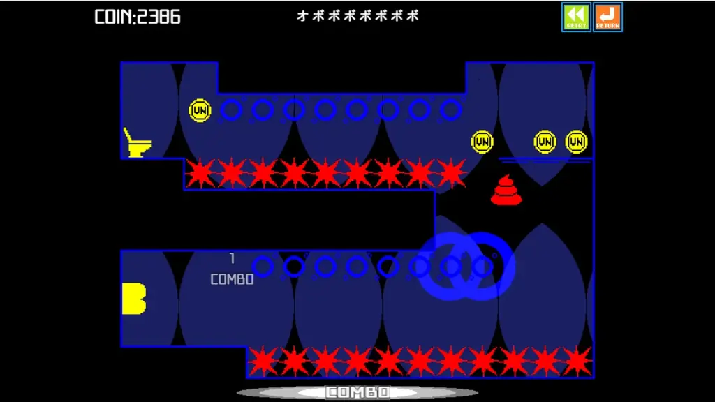 『ウンコテクニカ』はジャンプ操作のみで進行する、極めてシンプルな操作系を採用しています。しかし、操作が単純であるからこそ、精密なタイミングと反射神経が勝敗を分けます。ステージ数は150を超え、失敗と再挑戦を繰り返す高難易度設計です。