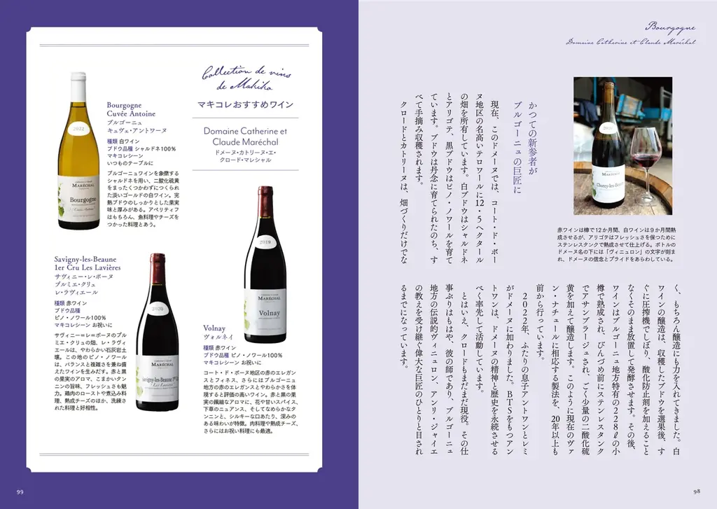 本書には、シーンごとにおすすめのマキコレとその特徴を示すセクションもあり、贈り物やクリスマスなどの場面での選び方にも言及されています。ナチュールワイン(自然派ワイン)については作り手のドラマや造りの哲学が詳述され、単に味を評価するだけではない深い理解へと導きます。
