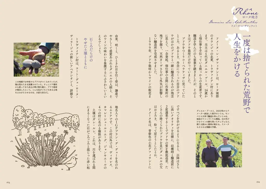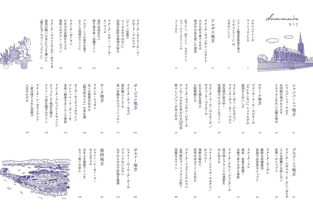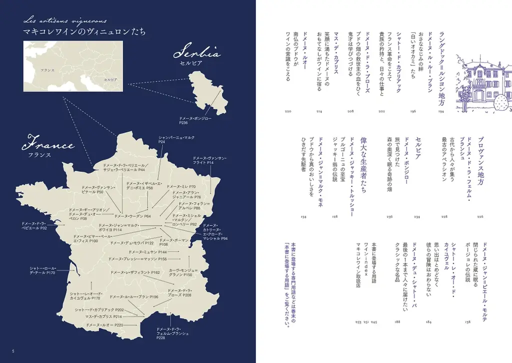 具体的な収録地域はアルザス、シャンパーニュ、ロワール、ブルゴーニュ、ボージョレ、ローヌ、ボルドー、南西、ラングドック=ルシヨン、プロヴァンス、そしてセルビアまで幅広く網羅しています。各章では地域の概説のあと、ドメーヌ紹介とおすすめワインを提示します。
