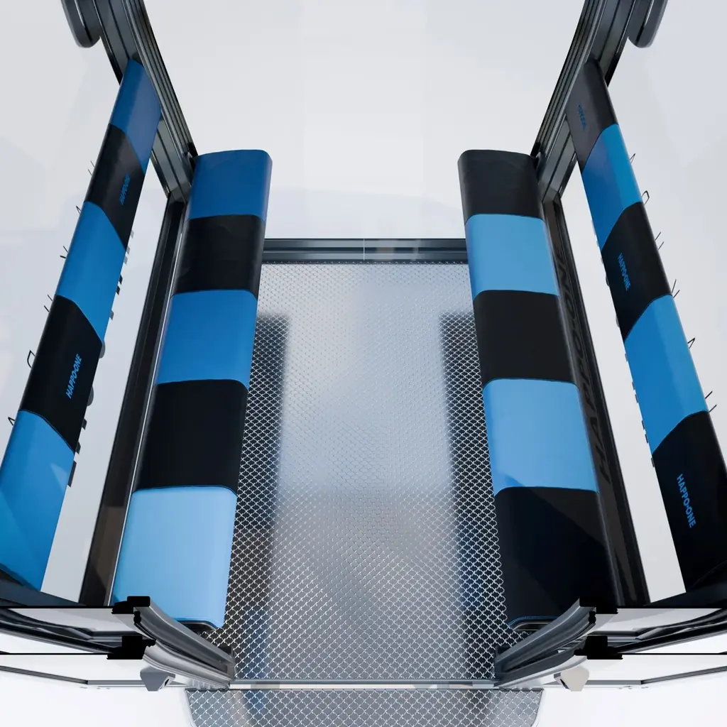 搬器は1台あたり10人乗りの大型タイプで、四面とも強化樹脂ガラスで覆われる設計により、全方位360°のパノラマビューを実現します。バリアフリー対応のユニバーサルデザインを採用し、乗降場床上と搬器に段差が生じない構造を確保することで、さまざまな利用者に配慮した設計です。