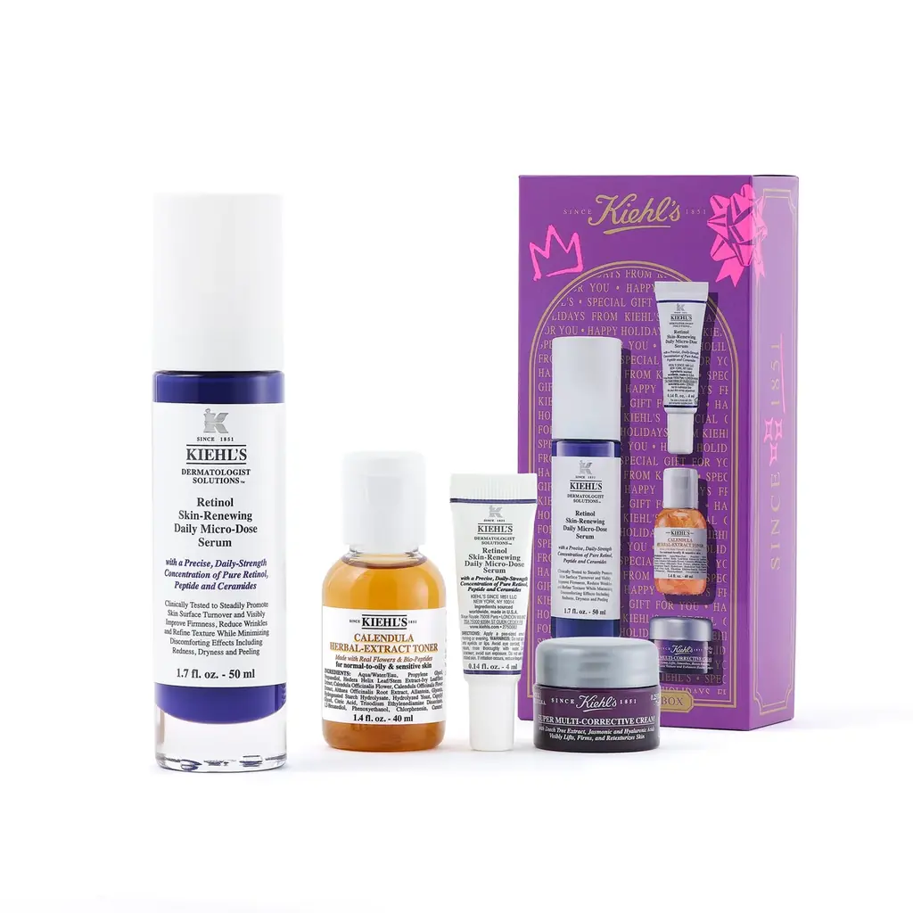 レチノール(整肌成分)配合の美容液を主役にしたセットで、毛穴の目立ちを含めた肌のなめらかさやハリ、ツヤをサポートする構成です。化粧水と保湿クリームが付属します。