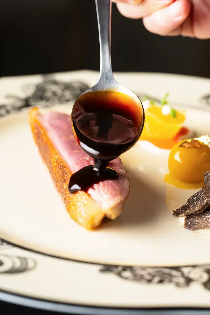 • 鴨 オレンジソース:オレンジの甘みと酸味が鴨の旨みを引き立てる一皿。クラシックな組み合わせを洗練した形で提示。