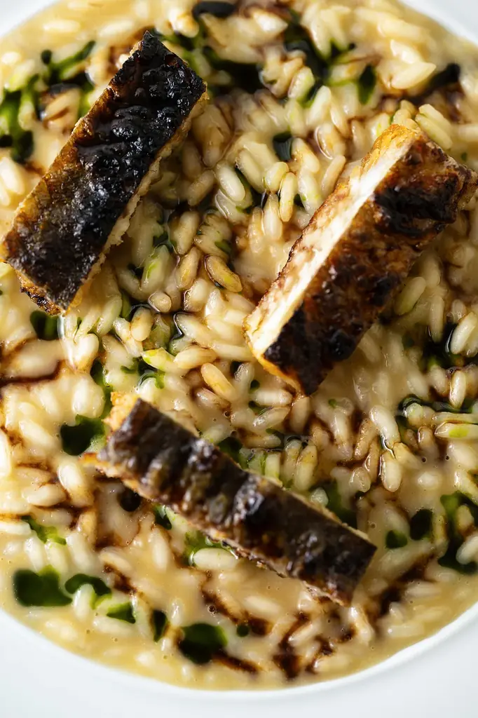 • 鰻とバルサミコのリゾット:香ばしい鰻とバルサミコの酸味を合わせたリゾットで、和の食材とイタリアンの技法を結ぶ試み。