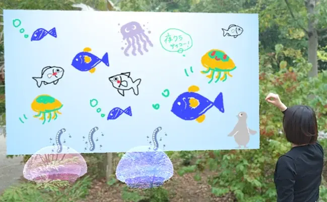 参加者はARアプリを使用して、現実の宮下公園上でバーチャルの掲示物や展示の様子をその場で確認できる。これにより、場所的に離れた他者とリアルタイムでコミュニケーションしながら同一の作品(ここでは“水族館”)を共同で構築することが可能になる。