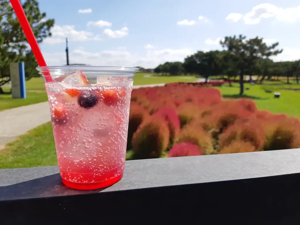 園内のPlayCafeでは、コキアをイメージした期間限定ドリンク「紅コキアのベリーソーダ」を販売中です。価格は500円で、コキアの紅葉を見ながら飲めるように設計されたメニューで、味わいとビジュアルの両面で季節感を演出しています。