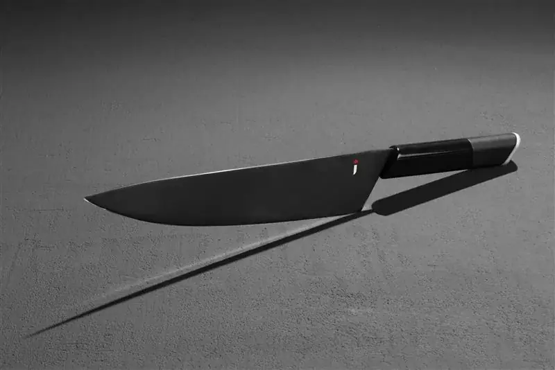 見た目では、日本刀に近いフォルムと「逆刃」を連想させる独自の仕上げが施されています。刀身は先端まで美しくカーブした形状で、ベースは西洋のシェフナイフに由来する「牛刀」。食材に応じた汎用性を確保しながら、日本刀らしさを演出しています。