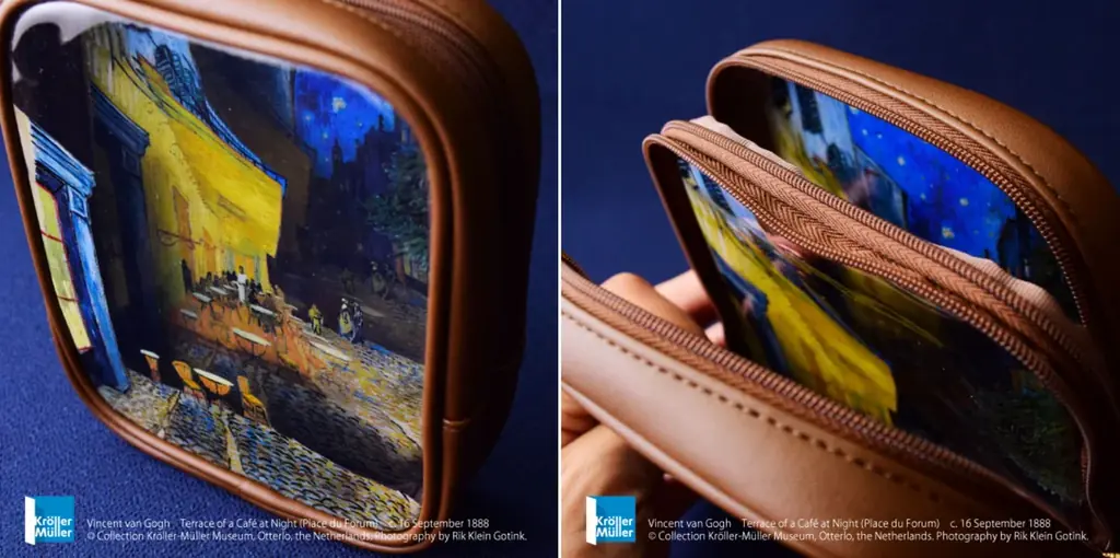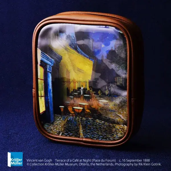本商品は《夜のカフェテラス》のモチーフを3層のレイヤーに分けてプリントすることで、作品の奥行き感を再現したポーチです。手前のテーブル席、軒下のガス灯で黄色く輝くカフェテラス、奥につづく街並みと夜空を分層表現しています。