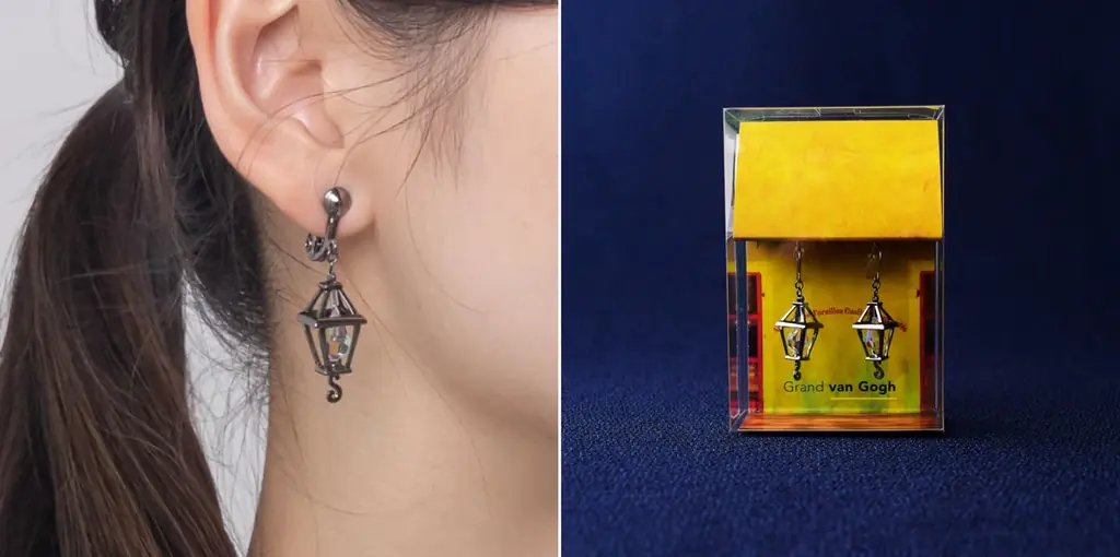 作品《夜のカフェテラス》の世界観を、日常で使える形に落とし込む試みとして、イヤアクセサリーやポーチ、フローティングペン、ティー&シュガーの4アイテムがラインナップされています。各アイテムは作品の象徴的な要素(ガス灯、夜空、馬車、カフェテラスの奥行きなど)をデザインモチーフとしており、鑑賞の余韻を持ち帰ることを想定した商品構成です。