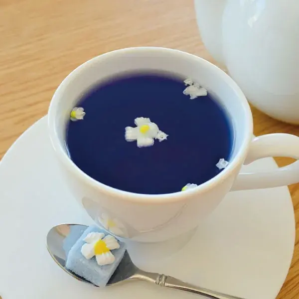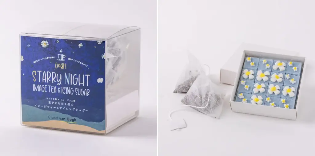 《夜のカフェテラス》の夜空をカップの中で表現するティー&シュガー。コバルトブルーで描かれた夜空をイメージした青色のお茶と、砂糖を溶かすと水面に浮かぶ星をイメージしたアイシング部分がセットになっています。商品説明では“コバルトブルーで描かれた夜空をイメージした青色のお茶”と具体的に記されています。