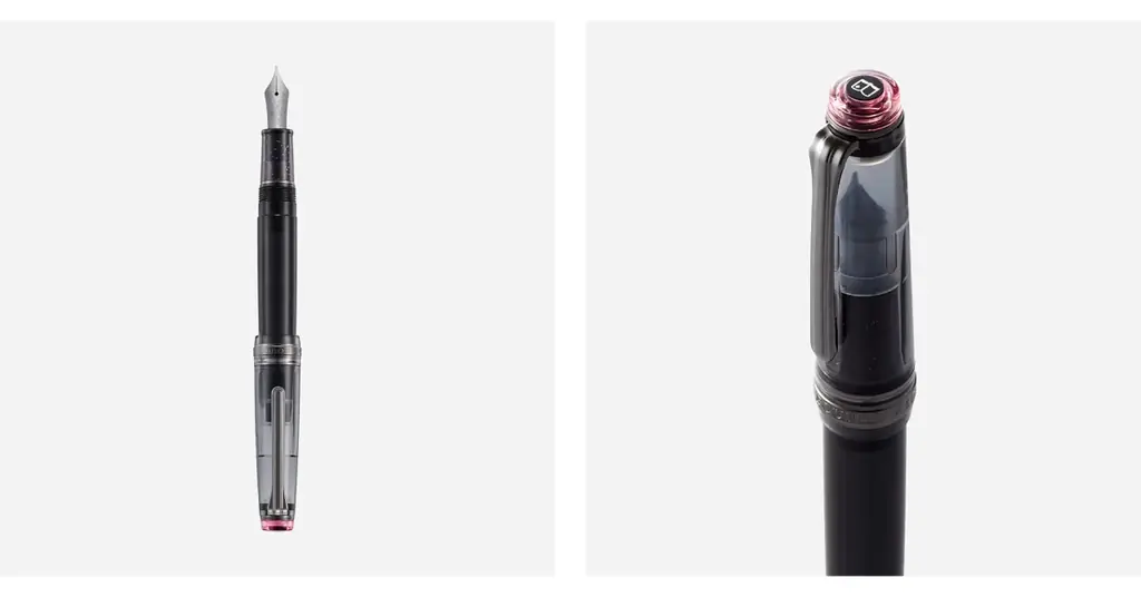 外観はブラックを基調にしつつ、部分的に透け感を持たせることで深みのある陰影を表現しています。大先(だいさき)にはシルバーラメが配され、蓋栓(ふたせん)にはクリアピンクを用いることでアクセントを効かせています。