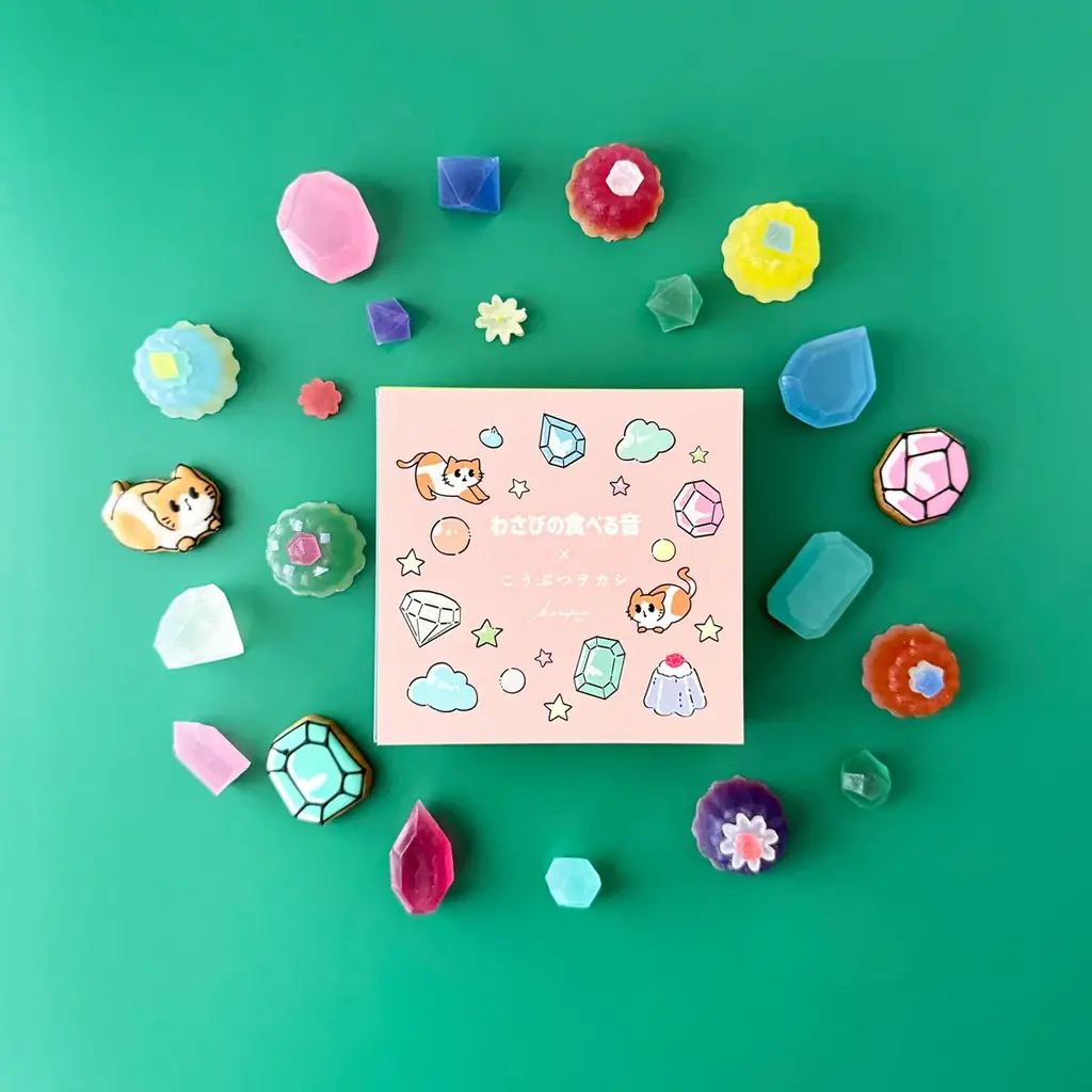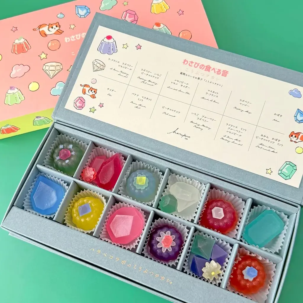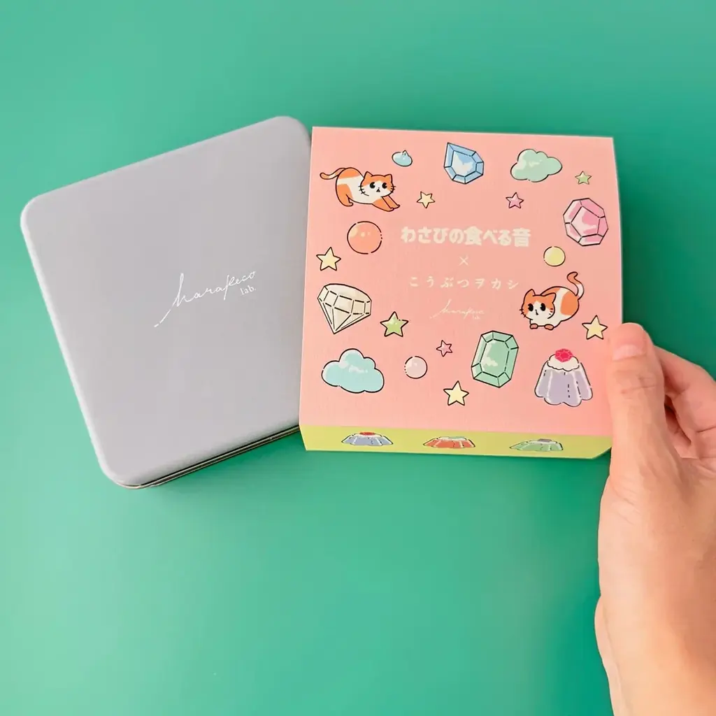 | 商品 | ・レトロ喫茶な宝石ゼリーのこうぶつヲカシ(4粒箱・缶入り・スペシャルボックス) ・わさびの食べる音×ハラペコラボ×桜坂AZUL 宝石クッキー(3枚) |