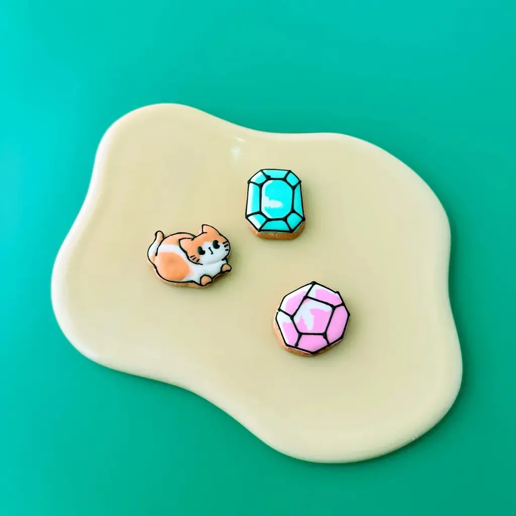特徴:動画内に登場するわさびさんの愛猫と宝石モチーフを組み合わせたアイシングクッキー。福岡発の菓子工房「桜坂AZUL」が製作し、保存料は不使用。