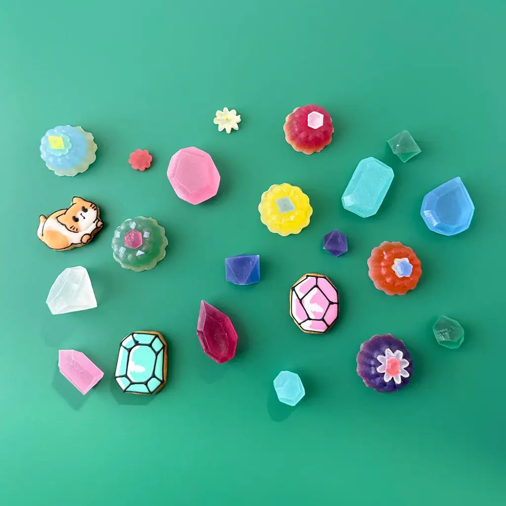 商品は大きく分けて琥珀糖を中心とした『レトロ喫茶な宝石ゼリーのこうぶつヲカシ』全3種と、『宝石アイシングクッキー』の合計4アイテムで構成される。琥珀糖は職人が手作業で作るため、一品ごとに微妙な表情の違いがある。