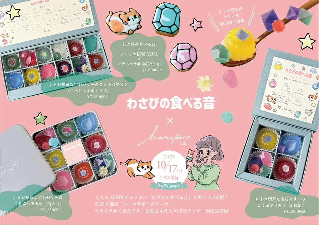 メルティングポットハラペコラボ株式会社(以下、ハラペコラボ)は、人気ASMRクリエイター「わさびの食べる音」とのコラボレーション第2弾として、琥珀糖(こうはくとう)とアイシングクッキーを組み合わせた限定スイーツを発表した。本コラボは2024年の初回企画に続く再演で、2025年版のテーマは「レトロ喫茶」。カラフルなゼリーや宝石を思わせるビジュアルを、職人の手仕事で琥珀糖に落とし込み、視覚と聴覚の両方で楽しめる体験を提供する。