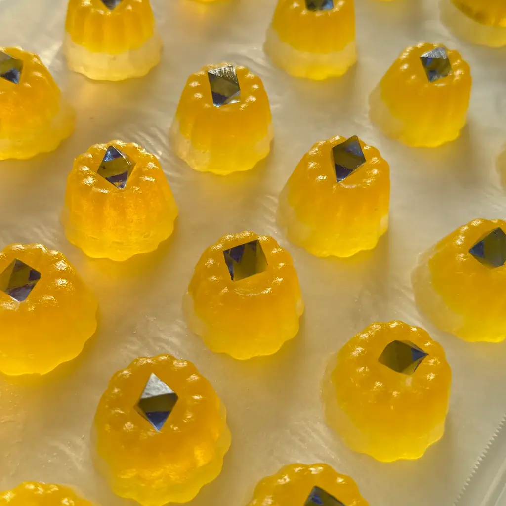 すべての商品にはコラボ限定のデザインが施されており、黄色の宝石ゼリーには今回限りのバナナ味(コラボ限定フレーバー)が採用されている。ゼリー型の琥珀糖は層仕立てになっており、バナナ味とマスカット味の二層構成が含まれる製品もある。