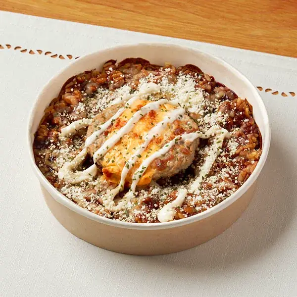 内容:デミグラスソースとチーズの濃厚な味わいが特徴のハンバーグドリア。デミグラスソースは飴色玉ねぎとグレイビーソースで奥深いコクを出し、バター風味のご飯と合わせています。