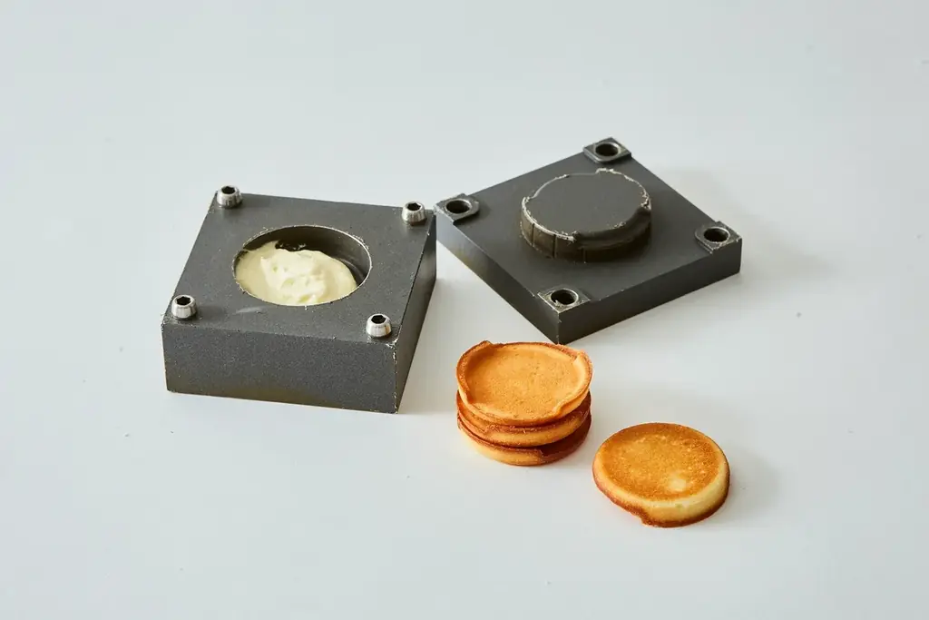 スノーサンドの核心は、直火での“挟み焼き”工程です。熱した鉄板でラングドシャを挟み焼きし、香ばしいカリカリ感と生チョコのなめらかさを両立させています。この工程により焼き色の個体差が生じることは手作りならではの特徴として説明されています。