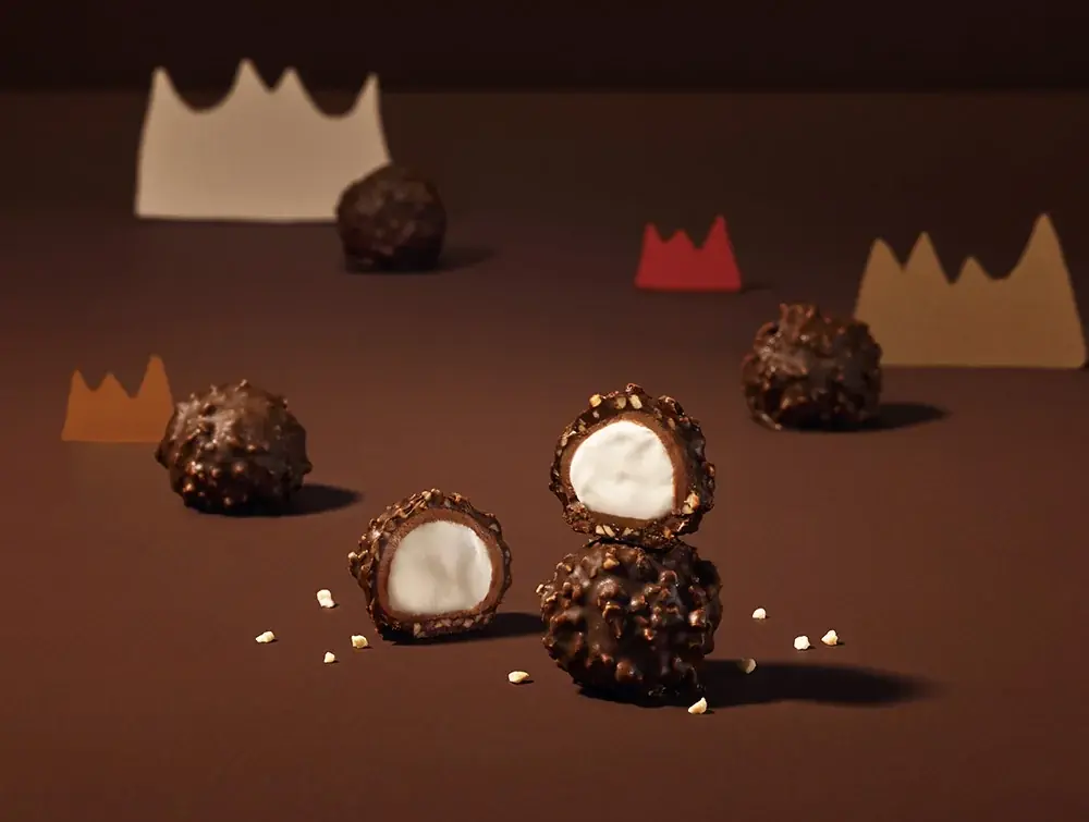 「スノーボール ごろり」は従来のスノーボールより一回り大きいサイズで、食感は「パリッ・フワッ・トロッ」のトリプル食感を打ち出しています。表面にはビターなアーモンドチョコレートをまぶした仕様です。