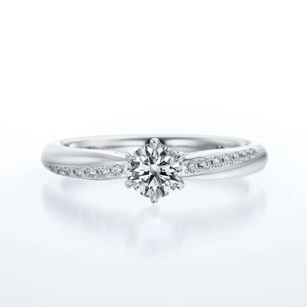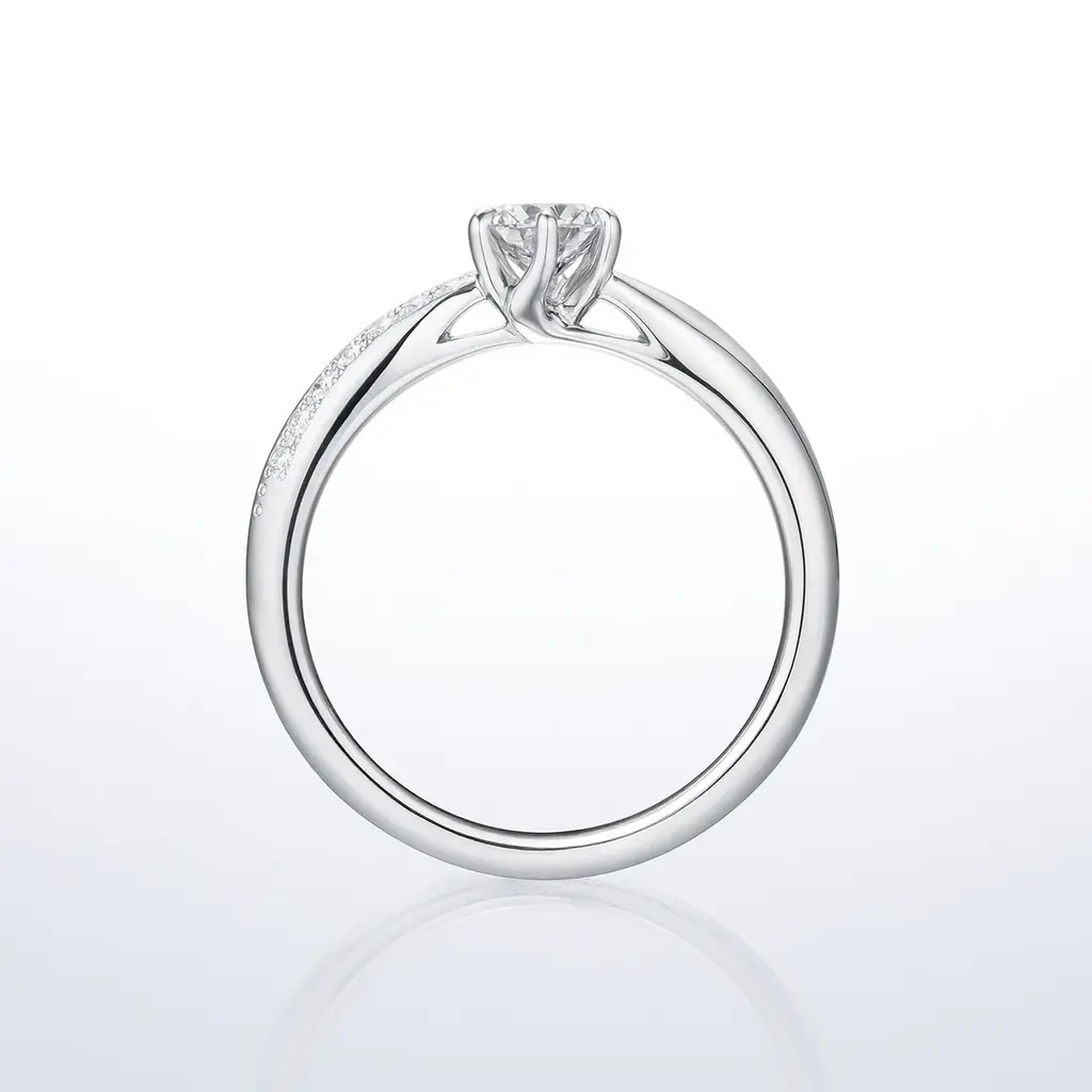 エンゲージリングは、中心に向かって細くなるアームがセンターダイヤモンドの存在感を高め、ストレートながら緩やかなウェーブを描くメレダイヤモンドのラインが上品で自然な印象を与えます。ダイヤモンドの軌跡が果てしない幸せを願う意匠として表現されています。