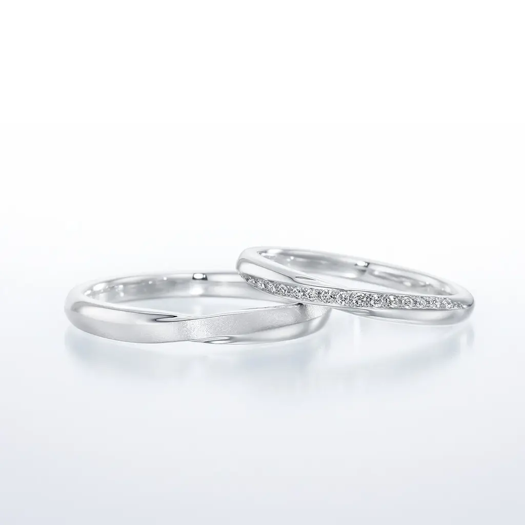マリッジリングは、なめらかな中間のくびれから生まれる陰影とメレダイヤモンドの煌めきを一体化させて、さりげなくインフィニティを表現します。右側は繊細に連なるメレダイヤモンドのエタニティ風リング、左側はゆるやかなカーブとダイヤモンドポイント加工を施したデザインで、対比によるペア感を楽しめる点が設計上の特徴です。